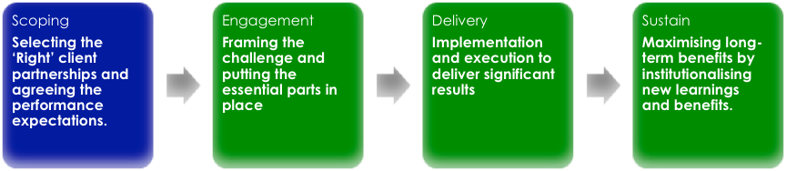 It is important to determine the right value-adding work streams (during the scoping and engagement phases) and resource them appropriately to deliver the transformation (throughout the delivery and sustain phases). Once the work streams have been commissioned, integrated key milestones are agreed and then coordinated until completion. If this is not considered, areas of the business are at risk of drift from the common goal and this ultimately affects benefits realisation.